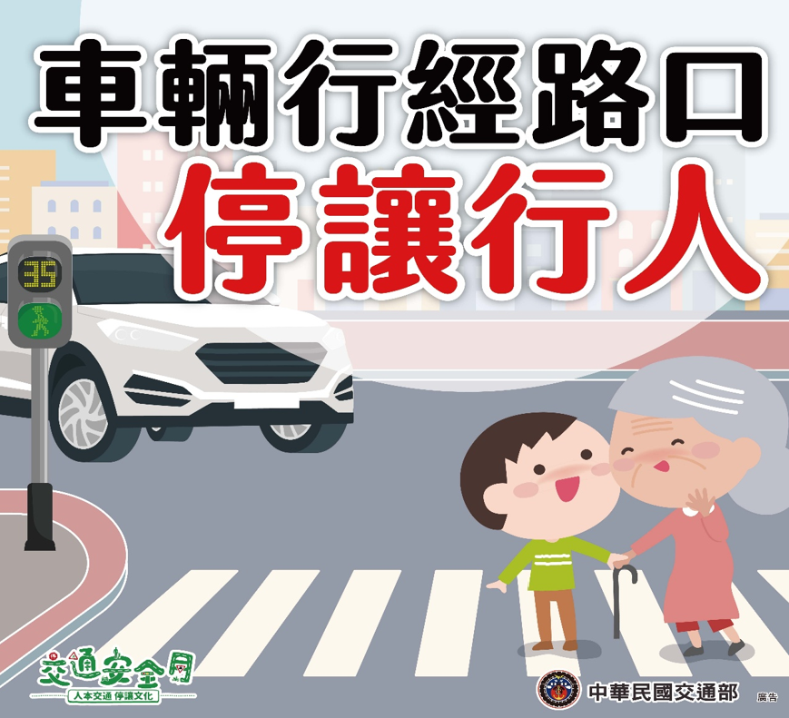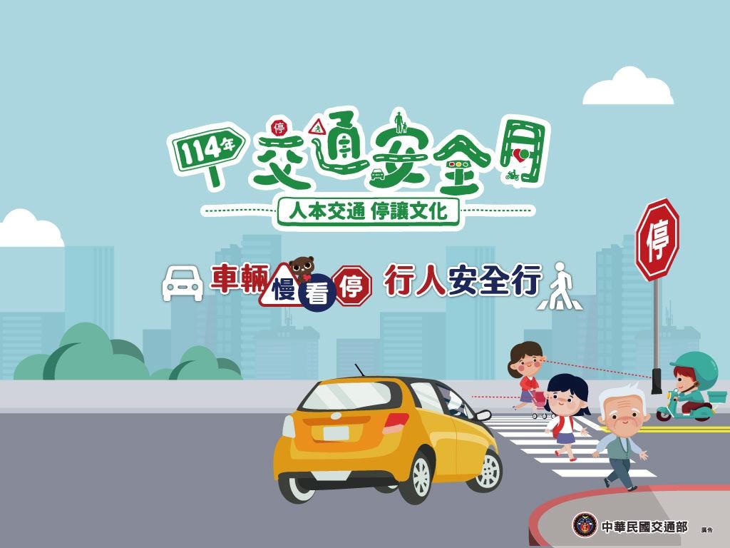 交通部自109年起推動全國交通安全運動,並訂定9月為交通安全月,114年主題為「人本交通-停讓文化」,口號為「車輛慢看停 行人安全行」。